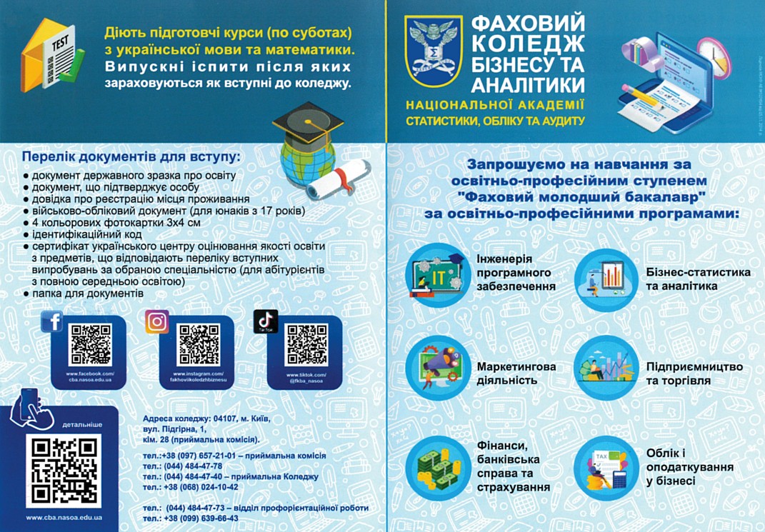 Фаховий коледж бізнесу та аналітики Національної академії статистики, обліку та аудиту (м. Київ) здійснює