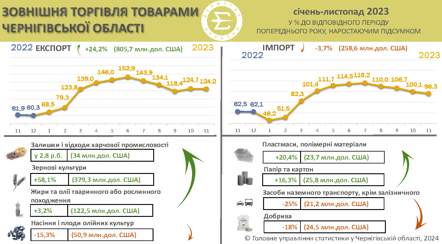 Зовнішня торгівля товарами Чернігівської області січень-листопад 2023 року