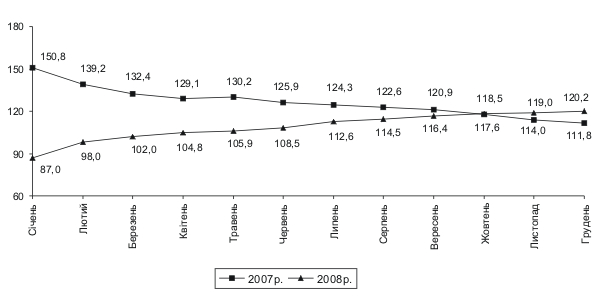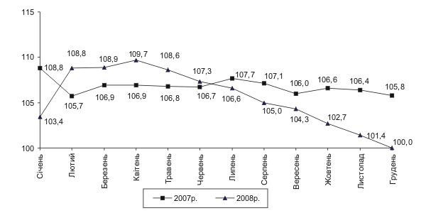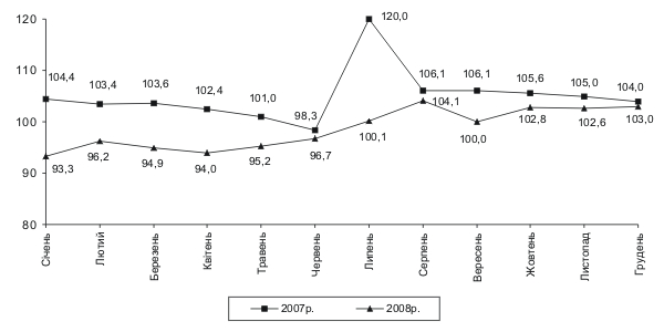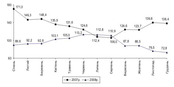 (наростаючим підсумком у % до відповідного періоду попереднього року) ![]() У добувній промисловості обсяги продукції зросли на 0,6%. Більше видобуто торфу та природних пісків. Водночас скоротився видобуток сирої нафти, природного газу, менше вироблено торф'яних брикетів та напівбрикетів. У переробній промисловості виробництво зменшилося на 0,3%. На підприємствах із виробництва харчових продуктів, напоїв та тютюнових виробів обсяги продукції скоротилися на 1%. На 3-39% зменшилися обсяги у виробництві напоїв, молочних продуктів і морозива, олії та тваринних жирів, борошномельно-круп'яній промисловості, виробництві цукру. При цьому на 8-33% зросли обсяги продукції у виробництві м'яса та м'ясних продуктів, хлібобулочних виробів, переробленні та консервуванні овочів і фруктів. На третину зросло виробництво яловичини й телятини свіжих чи охолоджених та макаронних виробів, на 26% - обробленого рідкого молока, на 15% - кисломолочних продуктів, на 3% - сиру свіжого. Водночас на 72% скоротилося виробництво нерафінованої соняшникової олії, на чверть - масла вершкового, на 16% - житнього та пшеничного борошна, на 9% - м'яса й субпродуктів харчових свійської птиці свіжих чи охолоджених, на 7,5 % - ковбасних виробів. Підприємства легкої промисловості зменшили виробництво продукції на 8,6%, зокрема в текстильному виробництві - на 17,1%. На 80% скоротились обсяги льону розволокненого, менше вироблено вовняних та бавовняних тканин, кордної тканини для шин. У виробництві одягу й хутра та виробів із хутра обсяги продукції зменшилися на 0,5%. Взуття вироблено 913 тис. пар, що на 2,7% менше, ніж у 2007р. В обробленні деревини та виробництві виробів із деревини обсяги продукції збільшилися на 5,6%. Зросло виробництво паркету дерев'яного щитового, панелей дерев'яних фанерованих. При цьому скоротилося виробництво деревини уздовж розпиляної чи розколотої, вікон, піддонів дерев'яних, дверей, їх рам та порогів. Підприємства целюлозно-паперового виробництва та видавничої діяльності збільшили виробництво продукції на 20,7%. Зросло виробництво шпалер, шкільних та канцелярських товарів, друкування книг, журналів та газет. Натомість менше вироблено паперу побутового та санітарно-гігієнічного призначення. У хімічній та нафтохімічній промисловості обсяги продукції зменшилися на 7,1%, у тому числі в хімічному виробництві - на 8,6%, у виробництві гумових та пластмасових виробів - на 0,1%. Знизився випуск пластмас у первинних формах, волокон хімічних, штучних оболонок із затверділих протеїнів. Водночас більше вироблено фарб та лаків на основі полімерів, прогумованих тканин, крім корду, мила і препаратів для використання в якості мила, засобів миючих та для чищення. На підприємствах із виробництва іншої неметалевої мінеральної продукції обсяги продукції зменшилися на 8,1%. Знизилося виробництво керамічної невогнетривкої цегли, збірних елементів конструкцій для будівництва з цементу, бетону чи штучного каменю. Водночас більше вироблено бетонних та будівельних сумішей. У металургійному виробництві та виробництві готових металевих виробів обсяги продукції збільшилися на 11,5%. Зросло виробництво резервуарів та цистерн металевих, сейфів. Натомість менше вироблено різних металевих конструкцій, котлів центрального опалення. На підприємствах машинобудування обсяги продукції скоротилися на 1,0%. На пі