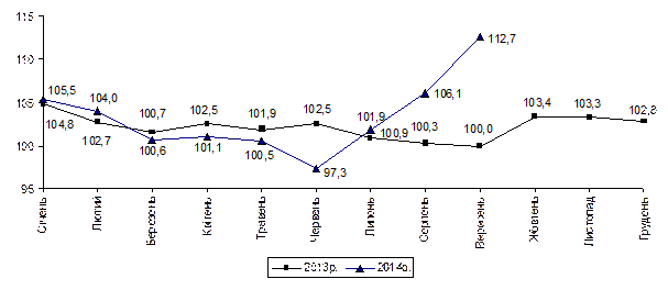 Індекс споживчих цін (індекс інфляції) у січні–вересні 2014р. становив 117,7% (у січні–вересні 2013р. – 98,7%). З початку року ціни на продукти харчування та безалкогольні напої зросли на 17,3%. Найбільше (в 1,6 раза) подорожчали фрукти, в 1,5 раза – рис, на 40,1% – цукор, на 32,8% – шоколад. На 20–26% зросли в ціні сало, м'ясо та м'ясопродукти, риба та продукти з риби, продукти переробки зернових; на 11,2–19% – маргарин, олія, яйця, кондитерські вироби з борошна, безалкогольні напої, хліб, макаронні вироби; на 3,5–9,5% – сири, масло, кисломолочна продукція та кондитерські вироби з цукру. Водночас овочі стали дешевшими на 29,8%, молоко – на 2,2%. Алкогольні напої подорожчали на 20,3%, тютюнові вироби – на 17,9%. Ціни (тарифи) на житло, воду, електроенергію, газ та інші види палива в цілому підвищилися на 28,1% за рахунок зростання плати за гарячу воду на 92,5%, газ природний – на 62,8%, водопостачання – на 52,9%, послуги каналізації – на 43%, газ скраплений – на 23,1%, утримання та ремонт житла – на 20,2%, електроенергію – на 11,3%. У сфері охорони здоров’я зафіксовано подорожчання фармацев-тичної продукції на 30,5%, амбулаторних послуг – на 17,5%. У сфері транспорту майже в 1,6 раза зросли в ціні паливо та мастила, на 46,2% – витрати на придбання транспортних засобів, на 34,8% – вартість проїзду в залізничному, на 16,6% – в автодорожньому пасажирському транспорті. Крім цього, більше ніж у 2 рази подорожчали туристичні послуги, на 20,6–28,1% – побутова техніка, домашній текстиль, телефонне й телефаксове обладнання, страхування особистого транспорту. На 11–18,4% зросли ціни на послуги дошкільних закладів, меблі та предмети обстановки, килими та інші види покриттів для підлоги, газети, книжки та канцелярські товари, послуги відпочинку та спорту.