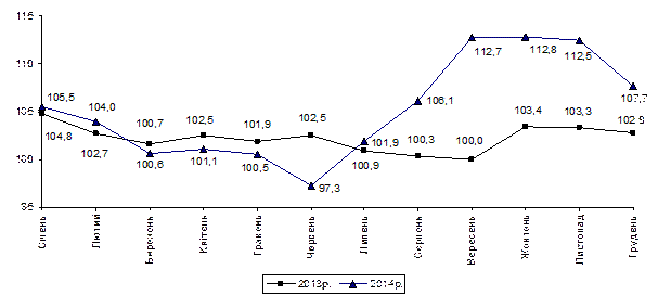 Індекс споживчих цін (індекс інфляції) за 2014р. в області становив 126,7%, в Україні – 124,9%. За рік в області ціни на продукти харчування та безалкогольні напої підвищилися на 27%. Найбільше (в 1,8 раза) подорожчав рис, в 1,7 раза – продукти переробки зернових (у т.ч. крупа гречана – у 2,4 раза), в 1,5 раза – фрукти, шоколад та спеції, на 48,4% – яйця, на 40,8% – сало. На 19,5–34,9% зросли в ціні кондитерські вироби з цукру та борошна, молочні суміші для дитячого харчування, цукор, хліб, макаронні вироби, мінеральні води, кава, чай, м’ясо та м’ясопродукти, олія, риба та продукти з риби; на 9,3–14% – масло, молоко, кисломолочна продукція, сири, фруктові соки та маргарин. Тютюнові вироби стали дорожчими на 24,8%, алкогольні напої – на 24,2% Ціни (тарифи) на житло, воду, електроенергію, газ та інші види палива в цілому підвищилися на 36,2% за рахунок зростання плати за гарячу воду майже у 2 рази, природний газ – в 1,6 раза, водопостачання – в 1,5 раза, опалення – на 49%, послуги каналізації – на 43%, утримання та ремонт житла – на 28,2%, газ скраплений – на 23,6%, електроенергію – на 11,3%. На 44,6% подорожчала фармацевтична продукція, на 24,1% – амбулаторні послуги. У сфері транспорту в 1,8 раза збільшилися витрати на купівлю транспортних засобів, в 1,6 раза – палива та мастил, на 45,3% зросла вартість перевезень залізничним, на 20,7% – автодорожнім пасажирським транспортом. Крім цього, у 2,1 раза зросли в ціні туристичні послуги, в 1,6 раза – килими та інші види покриттів для підлоги, на 28,1–44% – страхування особистого транспорту, побутова техніка, телефонне й телефаксове обладнання, особистий догляд, домашній текстиль, канцелярські товари. На 15,8–23,6% стали дорожчими аудіотехніка, фотоапаратура та обладнання для обробки інформації, газети, послуги відпочинку та спорту, меблі та предмети обстановки; на 4,7% – послуги дошкільних закладів.
